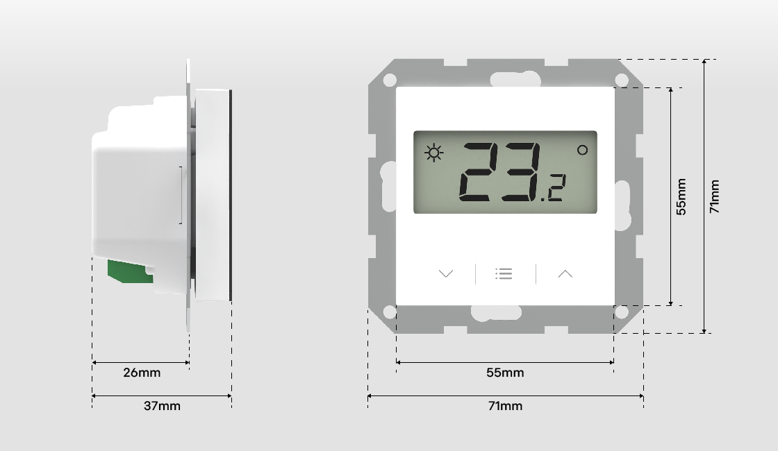 Mūsų stikliniai įrenginiai montuojami dedikuotuose stikliniuose rėmeliuose, kurių montavimo anga yra 55x55 mm. Dėl šių tikslių matmenų įrenginiai puikiai tinka standartinėms montavimo dėžutėms, užtikrindami estetišką apdailą ir idealų pritaikymą.