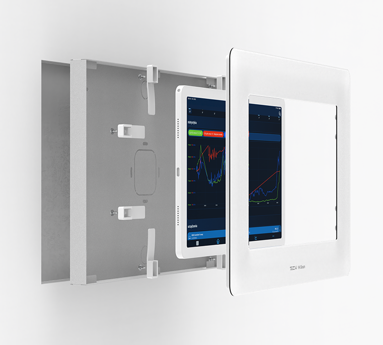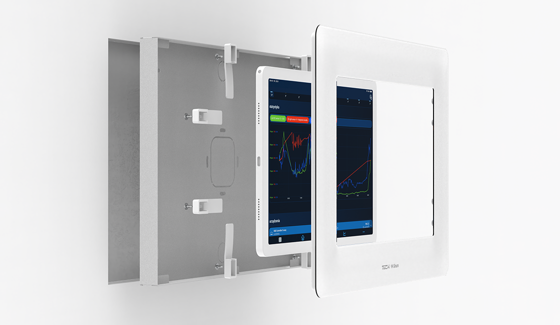 Montavimas atliekamas paruoštoje sienos angoje, užtikrinant stabilų rėmelio įtvirtinimą ir lengvą prieigą prie montavimo po tinku dėžutės, kas leidžia prijungti nuolatinį planšetinio kompiuterio maitinimą.