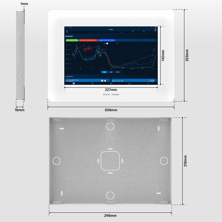 FT-01a rėmelis sukurtas atsižvelgiant į estetišką ir diskretišką 10,5” planšetinio kompiuterio montavimą sienoje. Metalinis rėmelio korpusas reikalauja 308 × 223 × 18 mm nišos sienoje, kad būtų galima visiškai paslėpti jį po tinku.