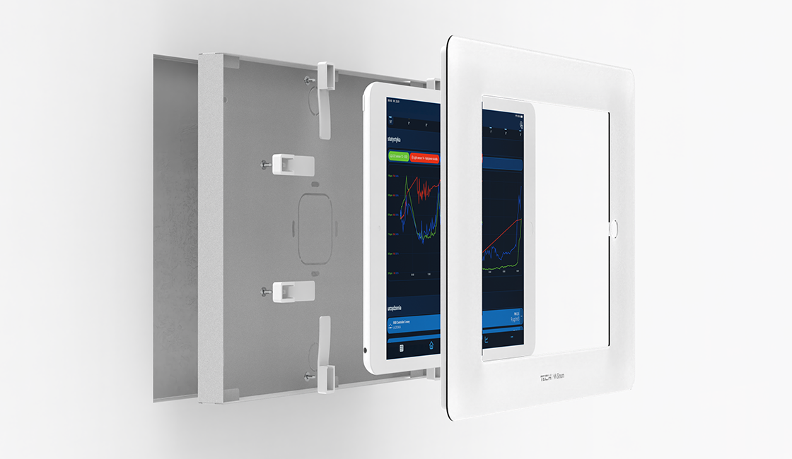 Montavimas atliekamas paruoštoje sienos angoje, užtikrinant stabilų rėmelio įtvirtinimą ir lengvą prieigą prie montavimo po tinku dėžutės, kas leidžia prijungti nuolatinį planšetinio kompiuterio maitinimą.