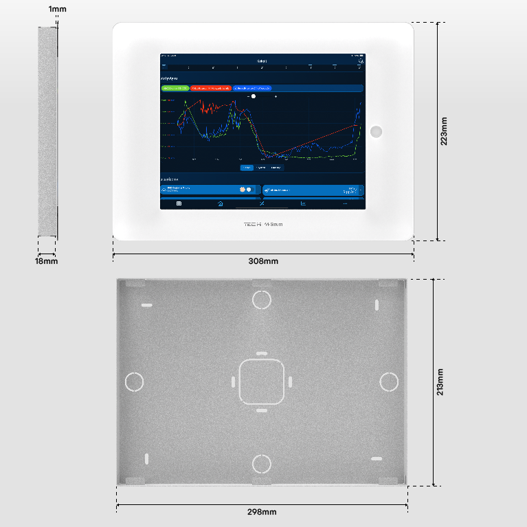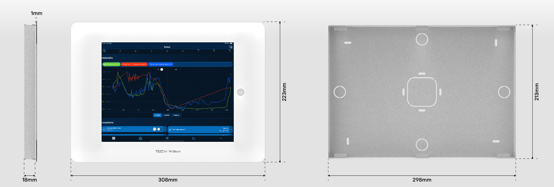 FT-01i rėmelis sukurtas atsižvelgiant į estetišką ir diskretišką Apple iPad 10,2” planšetinio kompiuterio montavimą sienoje. Metalinis rėmelio korpusas reikalauja 308 × 223 × 18 mm nišos sienoje, kad būtų galima visiškai paslėpti jį po tinku.