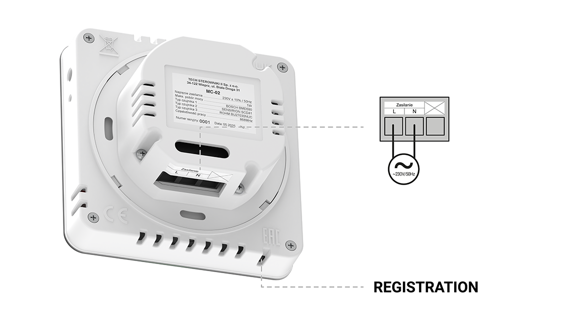 Registracija – Mygtukas, esantis galinėje įrenginio dalyje, naudojamas reguliatoriaus registracijai sistemoje. Jį paspaudus pradedamas poravimo su centriniu įrenginiu procesas. Po sėkmingos registracijos reguliatoriaus ekrane pasirodo atitinkamas pranešimas.