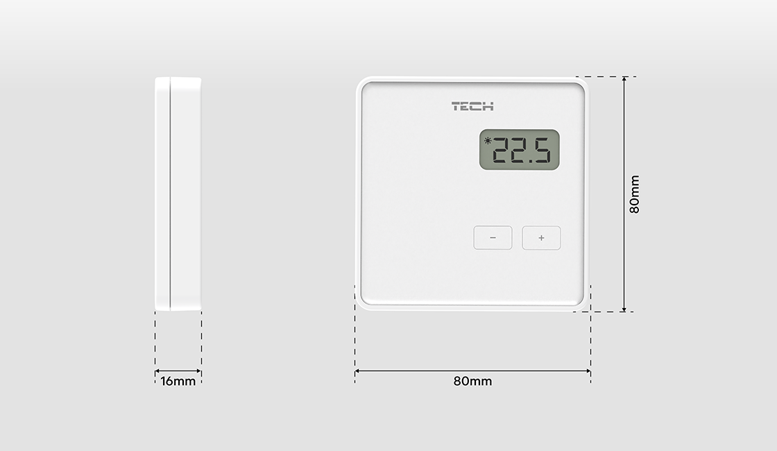 Reguliatorius R-8b sukurtas kompaktiškai, užtikrinant estetišką apdailą ir puikų pritaikymą interjere. Dėl plonos, tik 16 mm storio korpuso, įrenginys atrodo moderniai ir diskretiškai ant sienos.