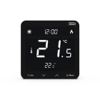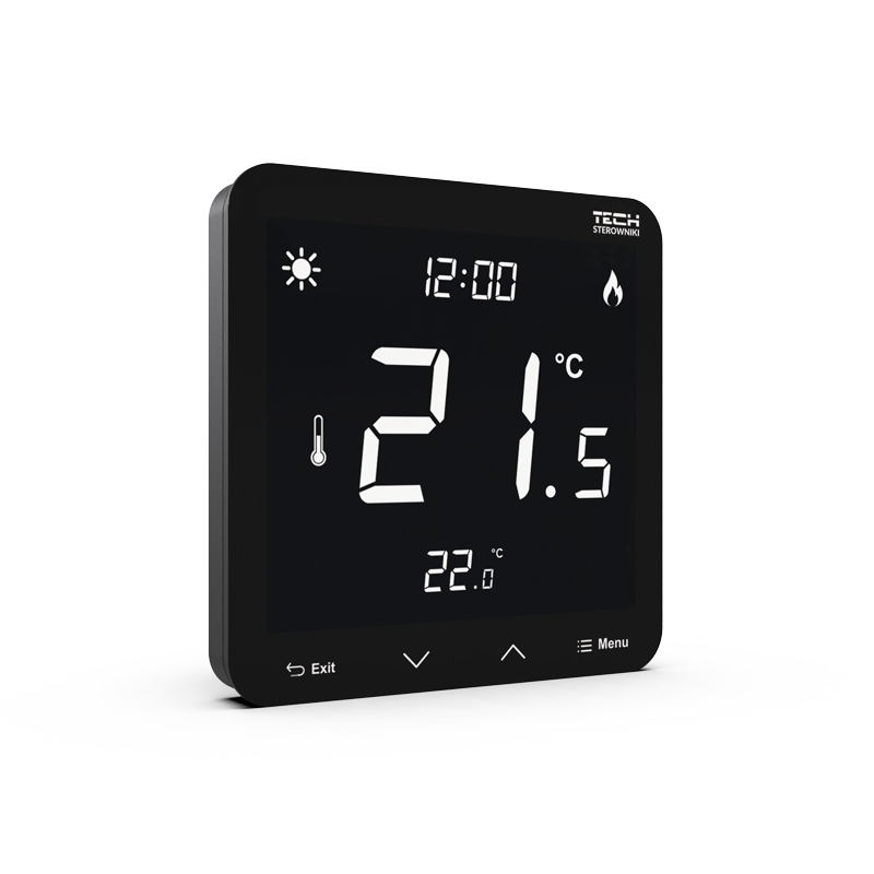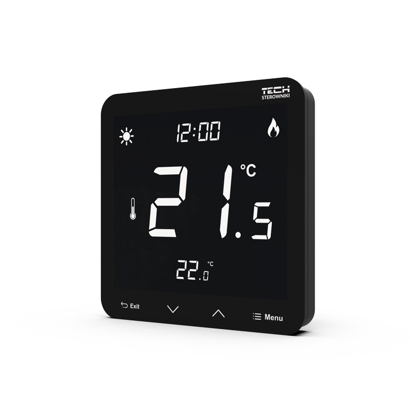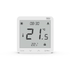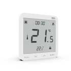 Belaidis kambario reguliatorius valdo šildymo įrenginį (pvz., dujinį, alyvinį, elektrinį katilą ar katilo valdiklį) arba vėsinimo įrenginį (pvz., oro kondicionierių).