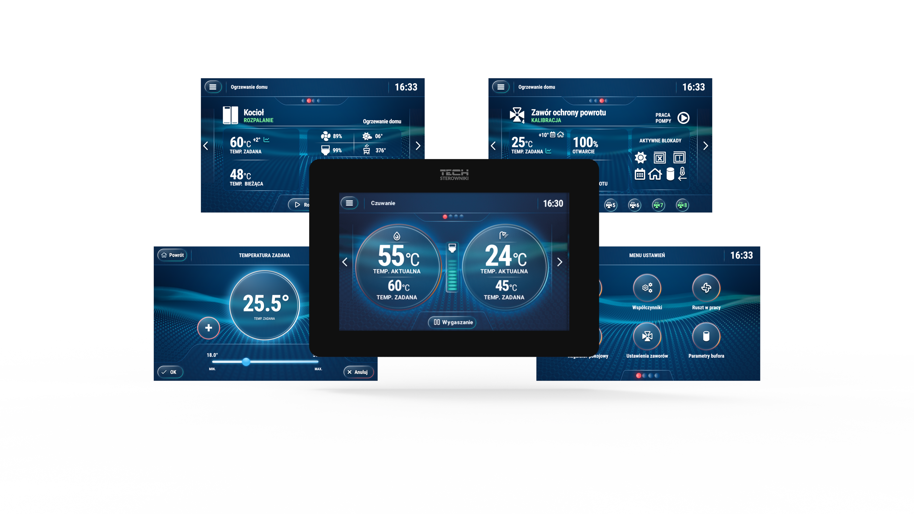 Vartotojo sąsaja sukurta taip, kad būtų aiški ir funkcionali. Pagrindiniame budėjimo režimo ekrane rodomos esamos ir nustatytos katilo bei karšto vandens (CWU) temperatūros, leidžiančios greitai peržiūrėti svarbiausius parametrus. Taip pat yra ekranai, skirti atskiroms instaliacijos sritims, tokioms kaip namo šildymas, grįžtamojo srauto apsaugos vožtuvas, katilo valdymas ir nustatymų ekranas, kuriame galima pritaikyti sistemos veikimo parametrus pagal individualius poreikius.