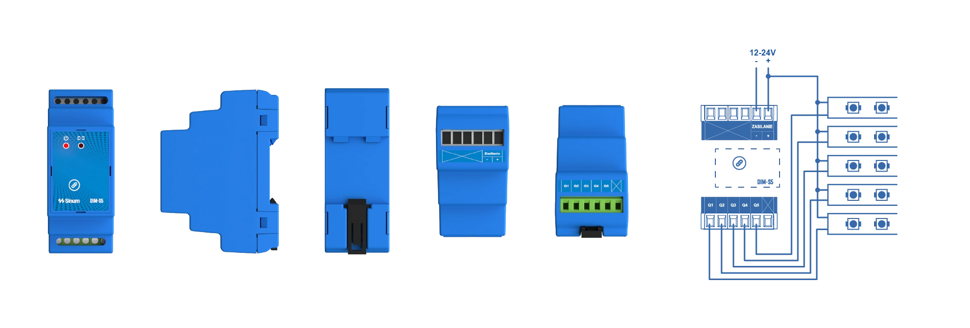 LED dimmers allow smooth adjustment of LED strip brightness from 0 to 100% of total lighting power. They support up to 5 LED strips simultaneously, depending on the selected scene, automation, or manual control. The module is powered by 12–24V DC. Each channel has a load capacity of 2.5A. Communication with the Sinum central unit is wireless.