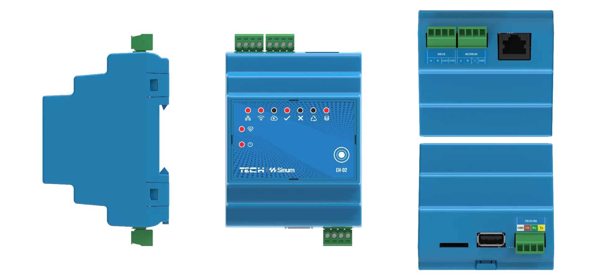DIN rail mounting, 24V DC power supply, interfaces: 1× USB 2.0, Micro SD slot, 1× RS-485 (SBUS), 1× RS-485 (MODBUS), RJ-45 network interface, Wi-Fi, 1× TECH RS.