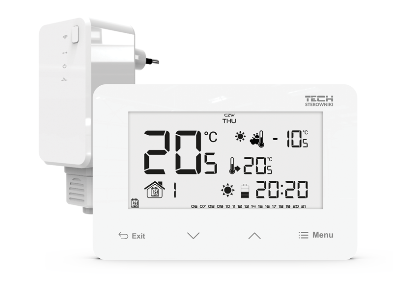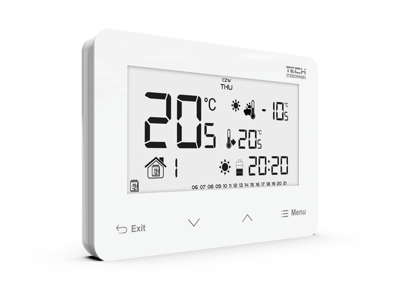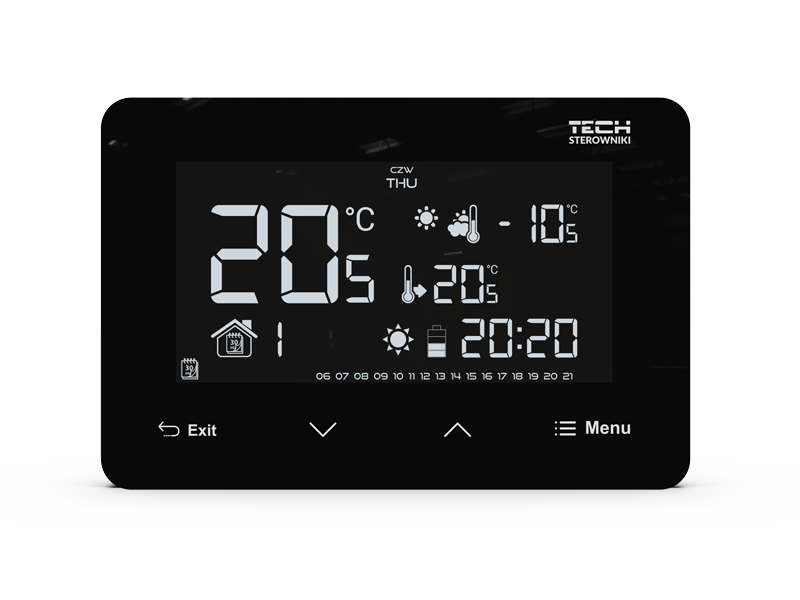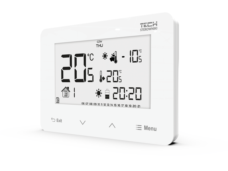 This function enables intelligent control of the heating device, increases efficiency and provides better thermal comfort. The room regulator, learning by itself, will select the optimal boiler activation time in order to achieve thermal comfort, so that the room is heated to the set temperature for a pre-set time.