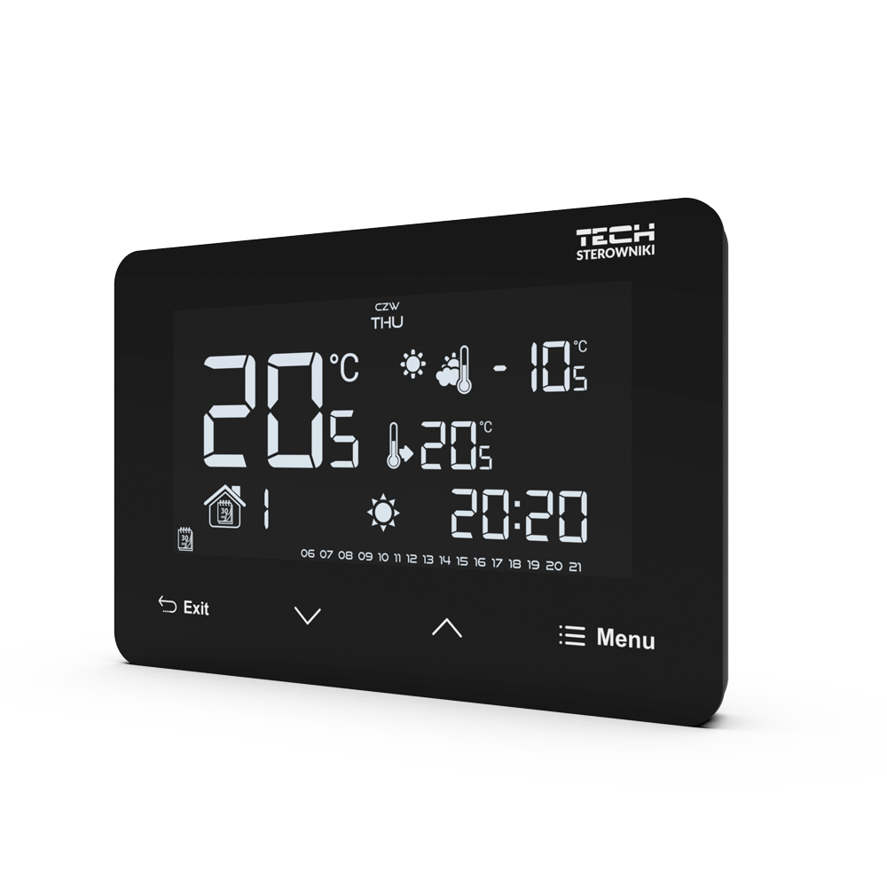 This function enables intelligent control of the heating device, increases efficiency and provides better thermal comfort. The room regulator, learning by itself, will select the optimal boiler activation time in order to achieve thermal comfort, so that the room is heated to the set temperature for a pre-set time.