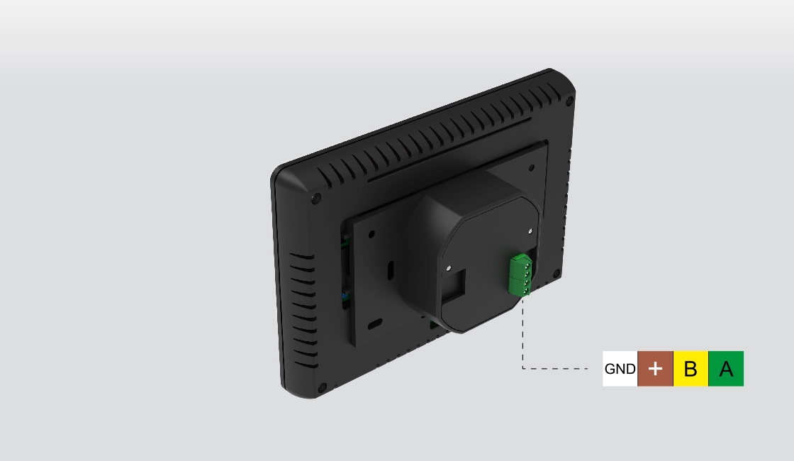 The panel communicates with the control module via a wired RS connection, ensuring stable and fast data exchange. The connector is located at the back of the device, allowing easy routing of the cable inside the wall. No additional power supply is required – both communication and power are provided through a single shared connection.