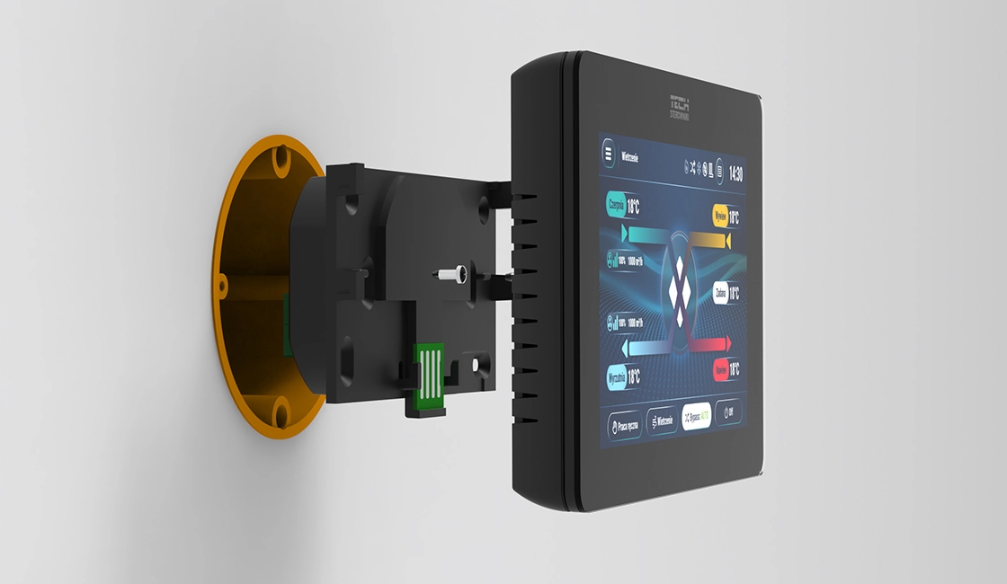 The flush-mount version is designed for installation in a wall recess up to 1 mm thick, allowing the device to be elegantly and discreetly integrated into the wall. The glass panel with a 5'' TFT touch display is the only visible element, ensuring a modern look and comfortable operation.
