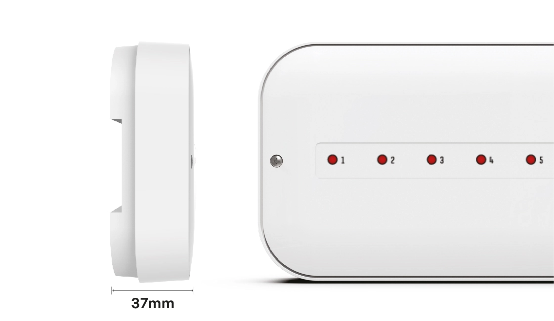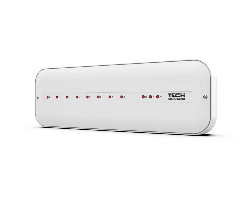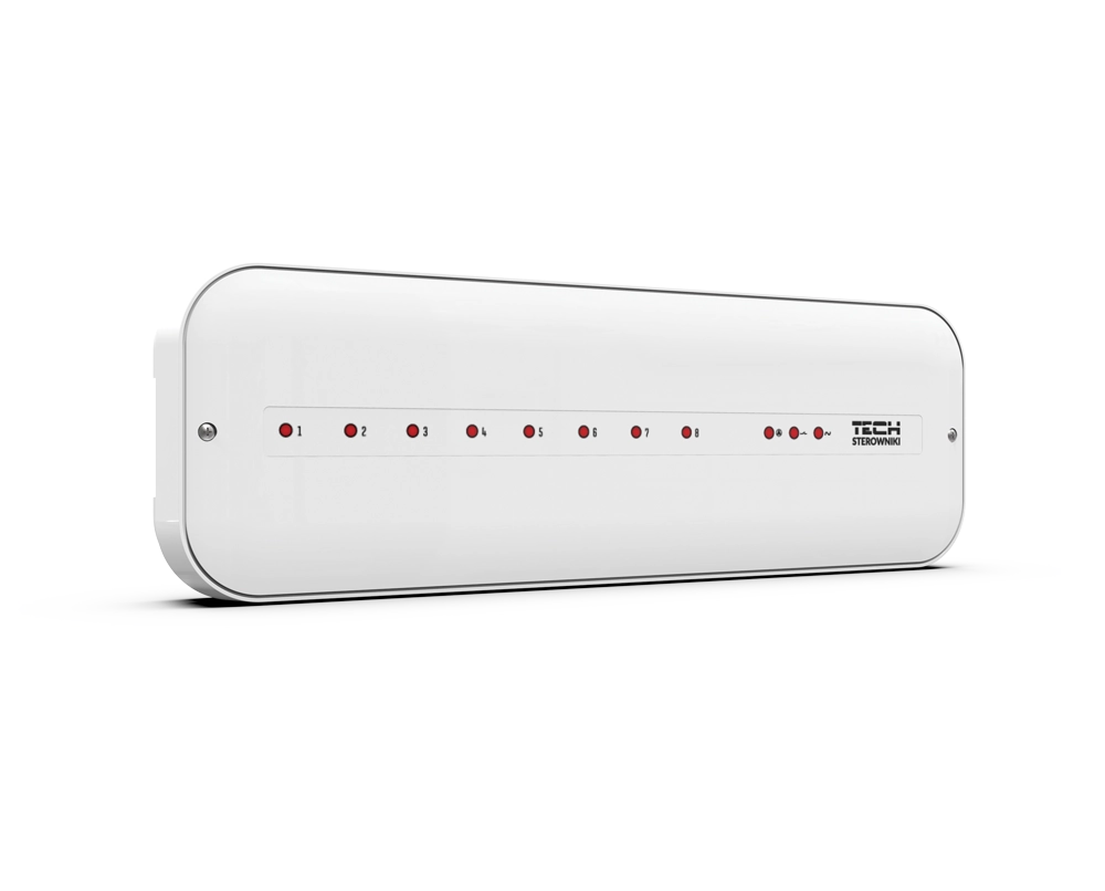 The wired underfloor heating controller is designed to manage the operation of electric actuators based on signals received from room controllers. A complete system—consisting of the wired underfloor heating controller, controllers, and actuators—ensures comfortable temperatures across 8 heating zones. The device can support up to 50 electric actuators using 8 two-state room controllers.
