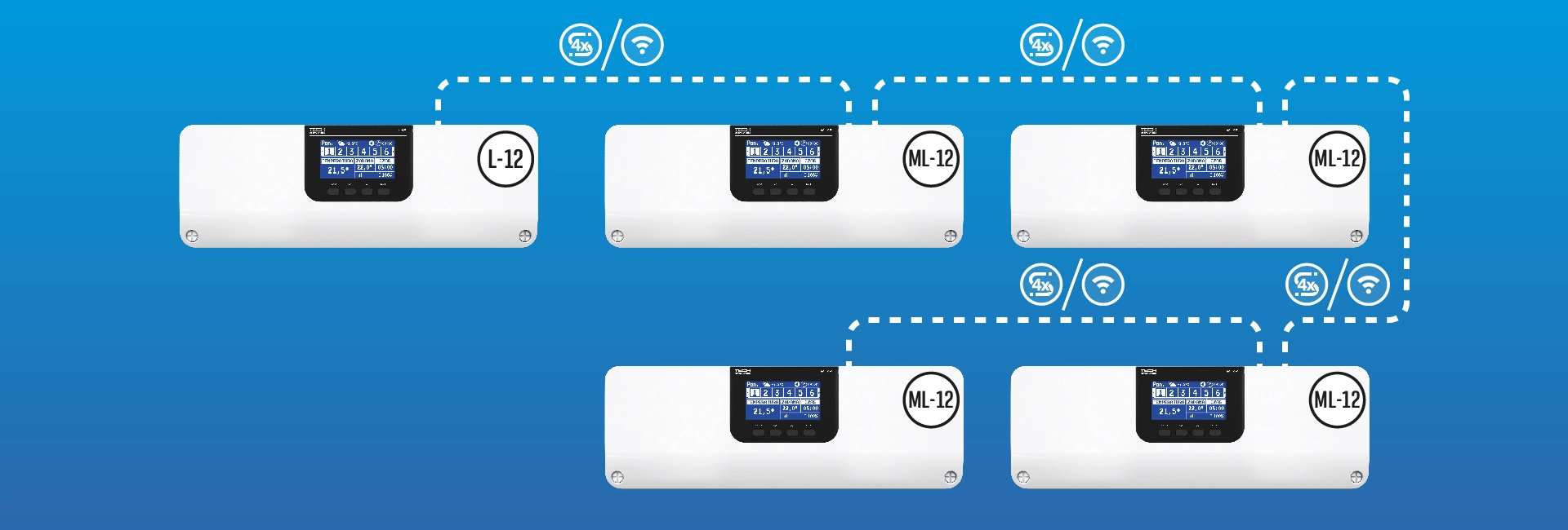 A wired actuator controller designed for managing underfloor heating systems. The ML-12 manifold controls thermoelectric actuators installed on valves and serves as an extension module adding up to 8 additional zones to the L-12 controller. The module does not operate independently. In a hybrid system, the manifold can also control wireless electric actuators such as G-X or STT-869.