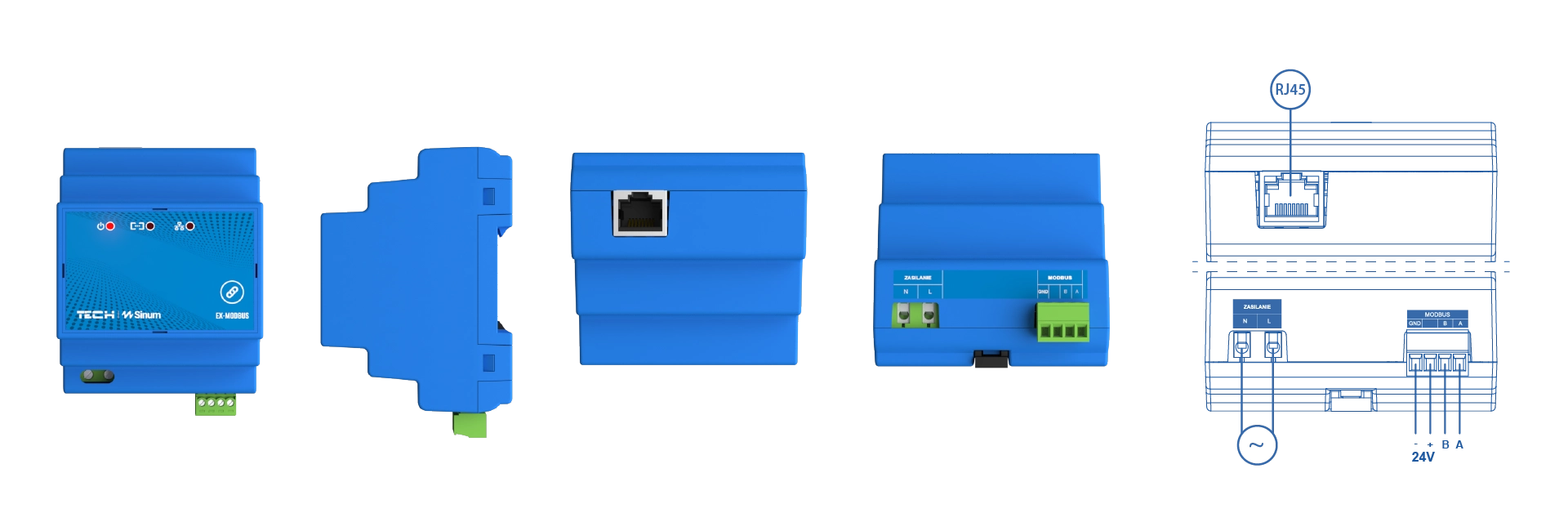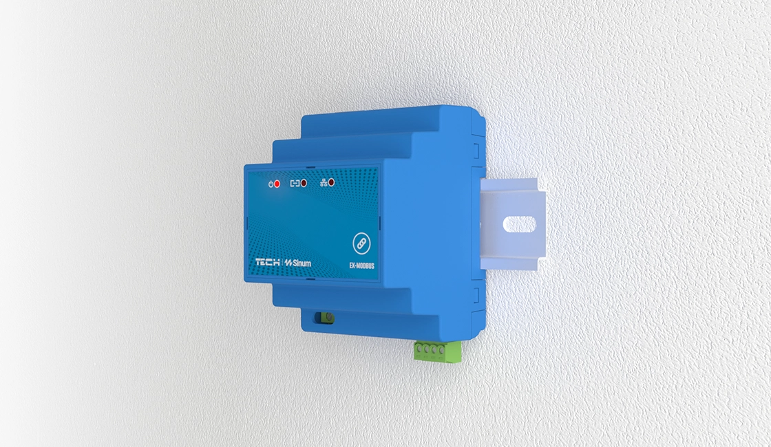 The EX-MODBUS is a device designed to extend the signal range of MODBUS devices. It expands the operational area of the system by collecting information from connected MODBUS devices and transmitting it via LAN or WiFi to the main device — the Sinum control unit.