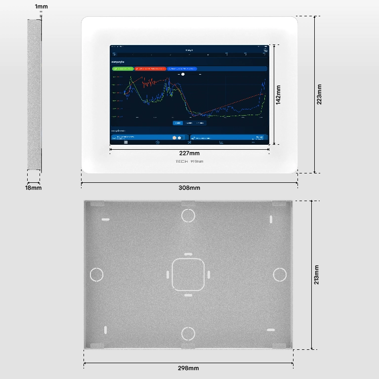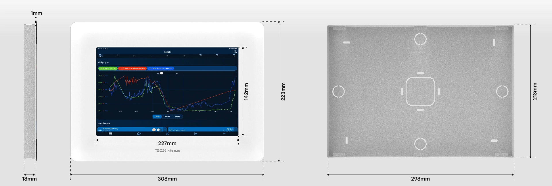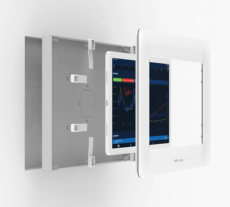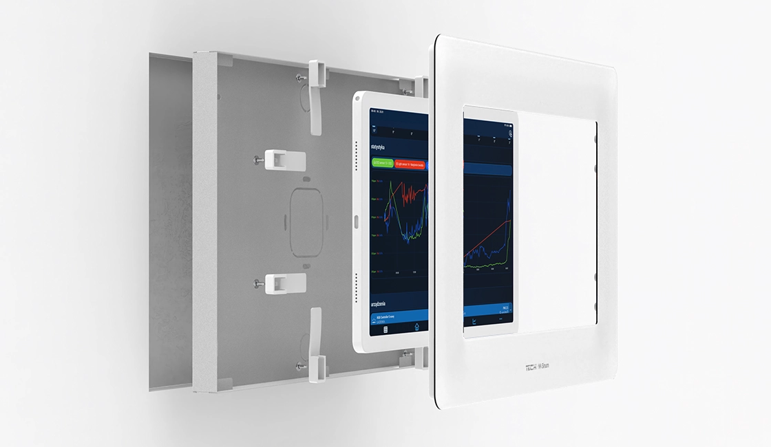 The FT-01a frame is designed for aesthetic and discreet installation of a 10.5” tablet in the wall. The metal frame casing requires a recess of 308×223×18 mm, allowing it to be completely hidden in the plaster.
