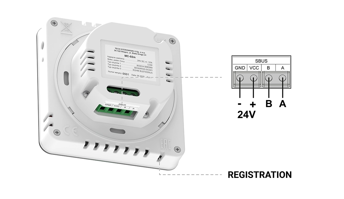 Registration - The button located on the back of the device is used to register the controller in the system. Pressing it initiates the pairing process with the central unit. After successful registration, a confirmation message will appear on the controller’s display.