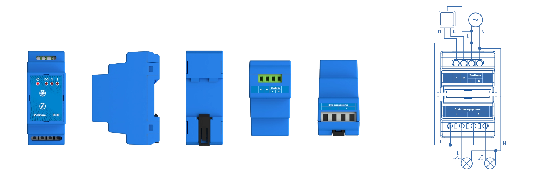 The PS-02 is designed for those who prefer to keep everything organized in one place — for example, inside a distribution cabinet. It features 2 relays with potential-free outputs and is mounted on a TH35 rail, allowing you to connect lighting circuits or other devices you want to control. It can also be connected to a signal from a push-button wall switch.