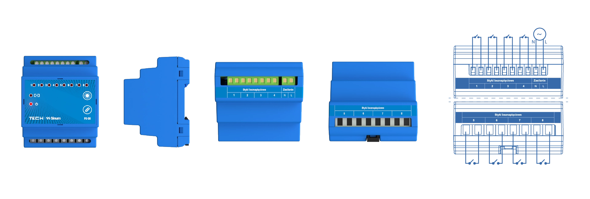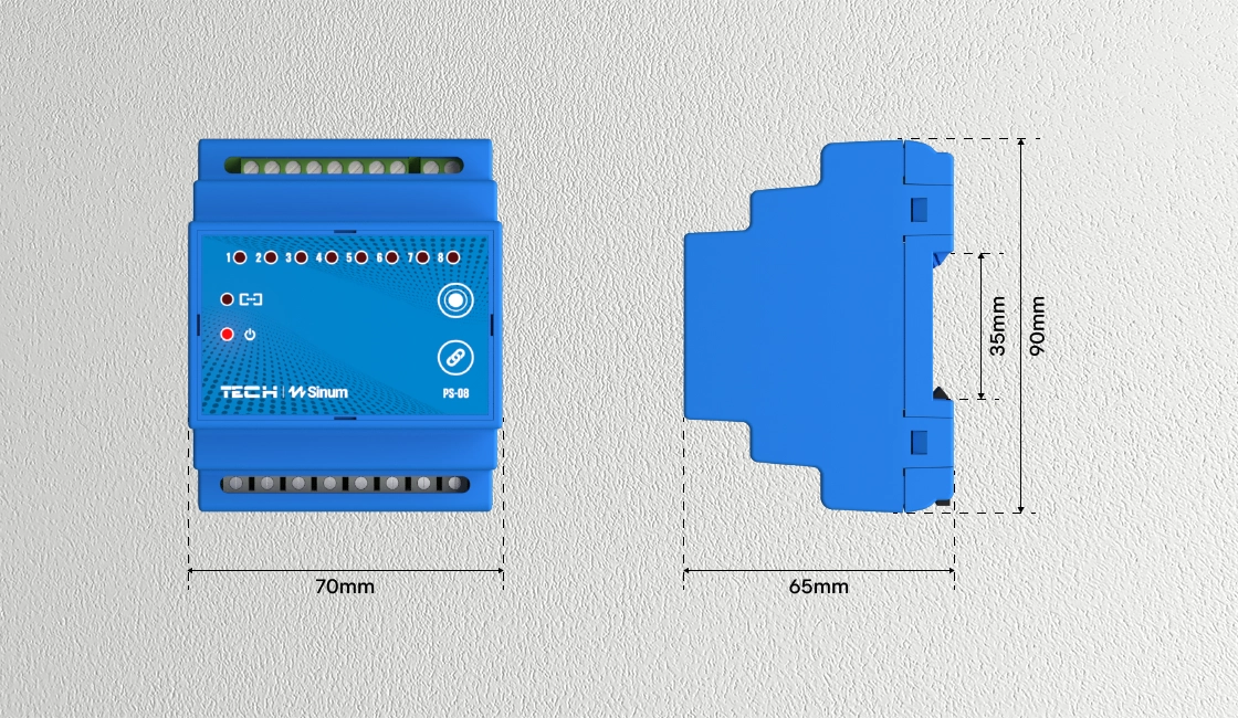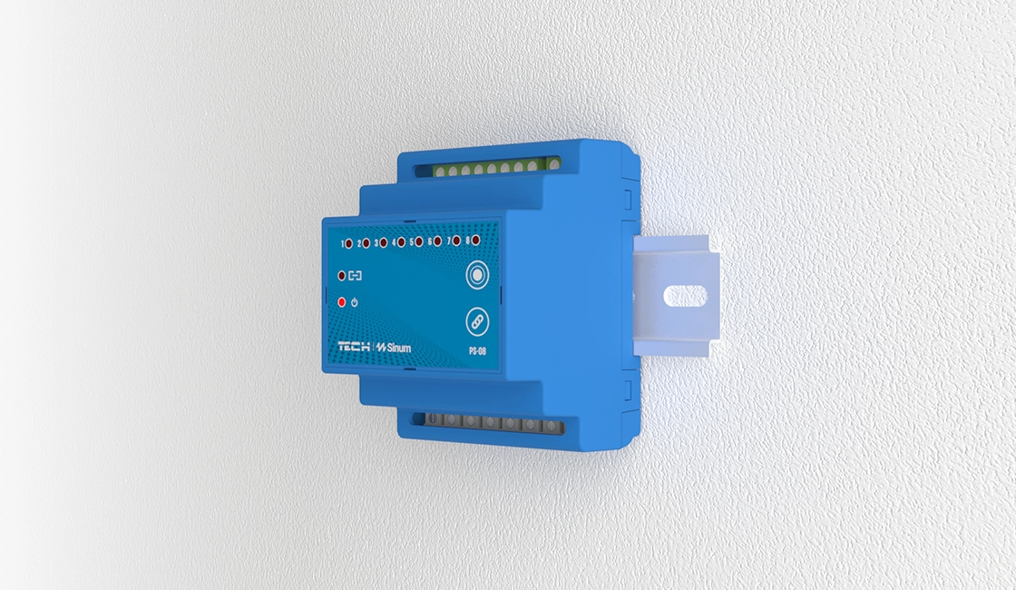 The PS-08 is designed for those who like to keep everything neatly organized in one place — for example, inside a distribution cabinet. It features 8 relays (potential-free outputs) and is mounted on a TH35 DIN rail, allowing you to connect circuits or devices directly after the circuit breaker. It can control up to 8 devices.