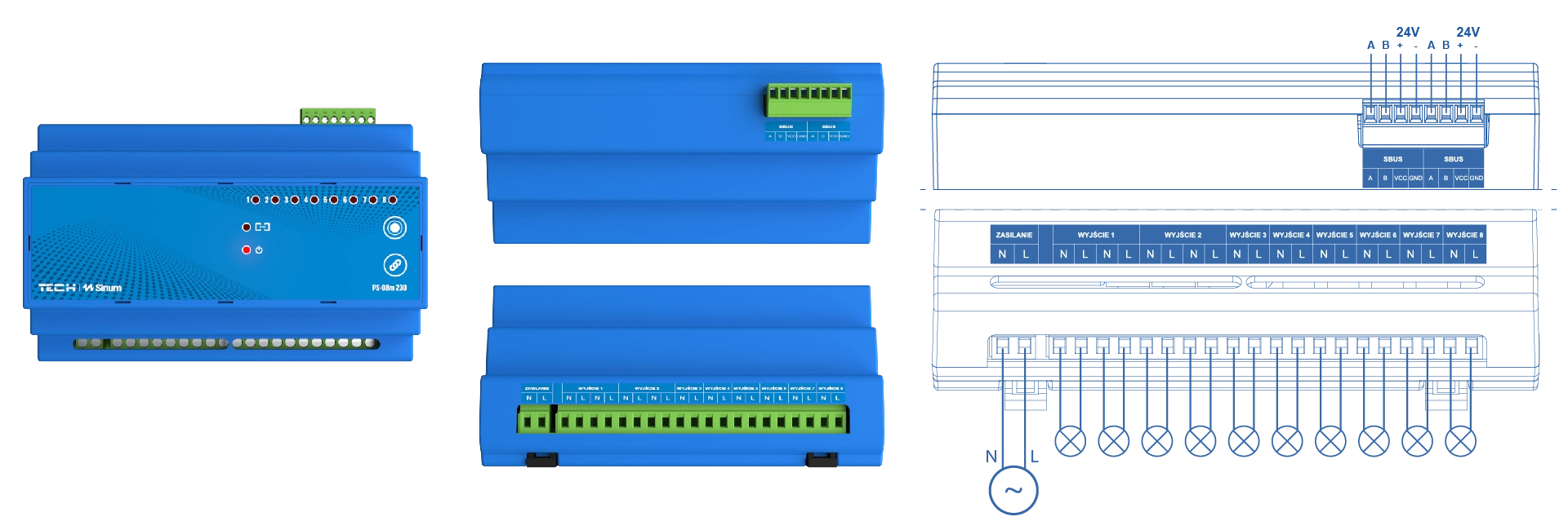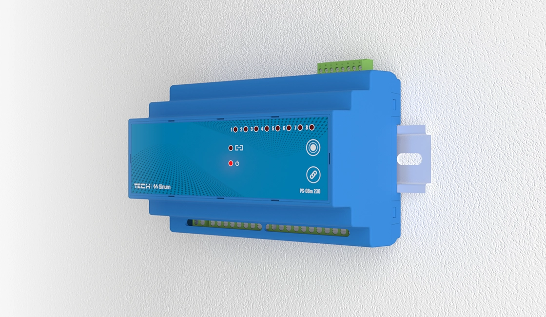 The PS-08m 230 communicates with the Sinum central unit via the TECH SBUS wired bus. Once connected, it enables independent control of each power/lighting point both through the mobile app and manually via a wall switch.