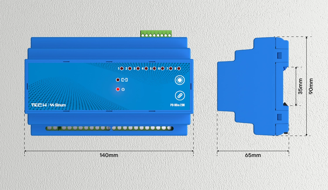 The PS-08m 230 is designed for those who like to keep everything organized in one place, such as a distribution cabinet. The PS-08m 230 has 8 relays – 230V output channels – and is mounted on a TH35 DIN rail, connecting circuits or devices directly behind the circuit breaker outputs. It allows connection of up to 8 devices.