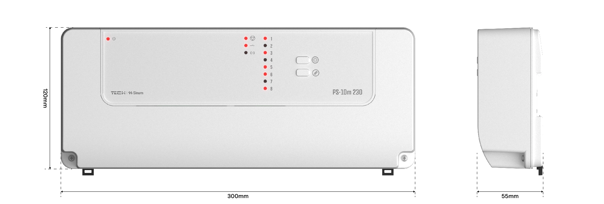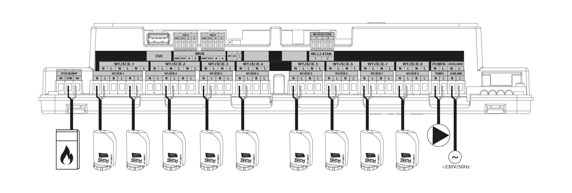 Dedicated controller for electrothermal valves for underfloor heating in the Sinum system. It combines simple and safe connection with the unlimited capabilities of the system. It features 8 voltage outputs for controlling up to 50 thermostat actuators, 1 dedicated voltage output for pump control, and 1 potential-free contact. Additionally, the strip is equipped with 2 two-state inputs.