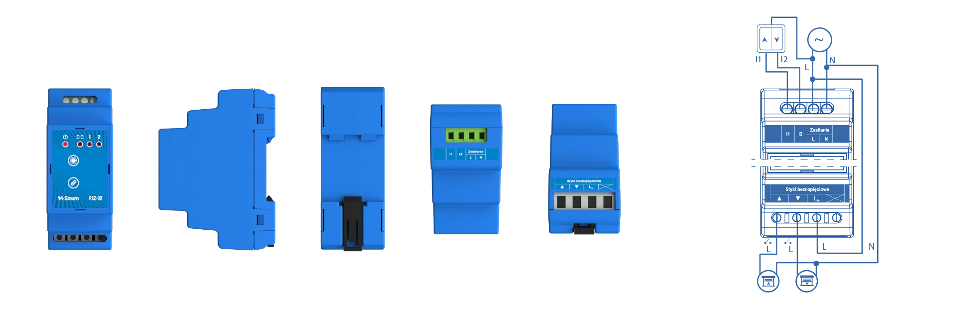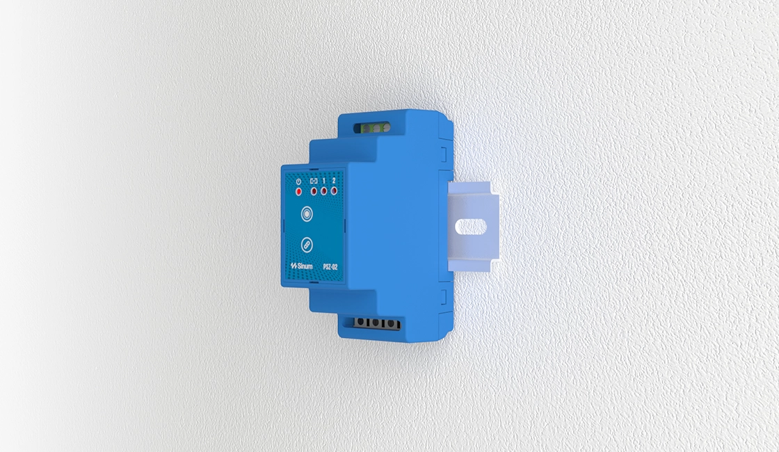 The PSZ-02 is designed for those who like to keep everything neatly organized in one place — for example, inside a distribution cabinet. It features 2 relays and is mounted on a TH35 DIN rail to control connected blinds. It can also be connected to a control signal from a wall-mounted blind switch.