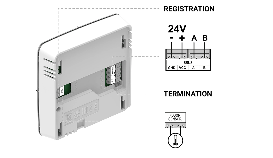 Registration – The button located at the top of the device is used to register the regulator in the system. Pressing it initiates the pairing process with the central unit. Once the registration is successfully completed, an appropriate message will appear on the regulator's screen.