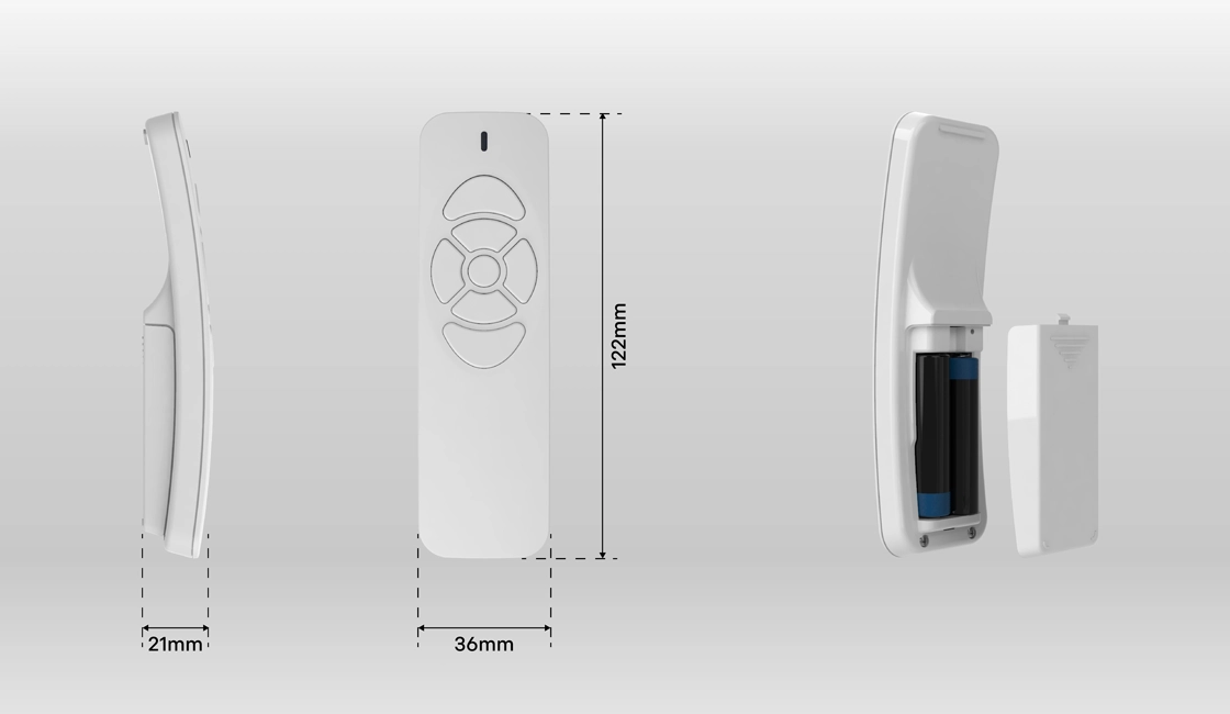 The RC-07 wireless remote has been designed with compact dimensions—122 mm in length, 36 mm in width, and 21 mm in thickness -making it perfectly suited for home use. Its slim design ensures it fits comfortably in the hand, providing ease of everyday use. Thanks to its small size, the device is easy to store and ideal for managing home automation systems.