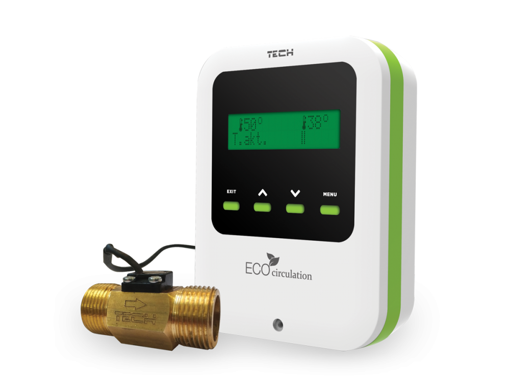 Контроллер ST-11 Eco Circulation - предназначен для управления циркуляцией ГВС, обеспечивая индивидуальным потребностям каждого пользователя. Контроллер экономит воду, электроэнергию и оборудование, работающее в системе (например циркуляционный насос). Сокращает время ожидания пользователя на горячую воду самым экономным способом, при этом не влияя на комфорт пользования. Контроллер ST-11 Eco Circulation контролирует работу циркуляционного насоса, ускоряя подачу теплой воды, при ее отборе потребителем, меняя ее на теплую воду с заданной температурой в ветви циркуляции. Система управления контролирует заданную пользователем температуру в ветви циркуляции и только после понижения заданной температуры включает циркуляционный насос, не создавая тепловых потерь. Повторная работа насоса наступает только тогда, когда пользователь запросит горячую воду и одновременно при падении температуры в ветви циркуляции.