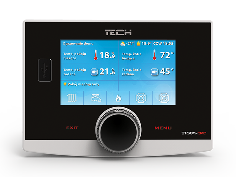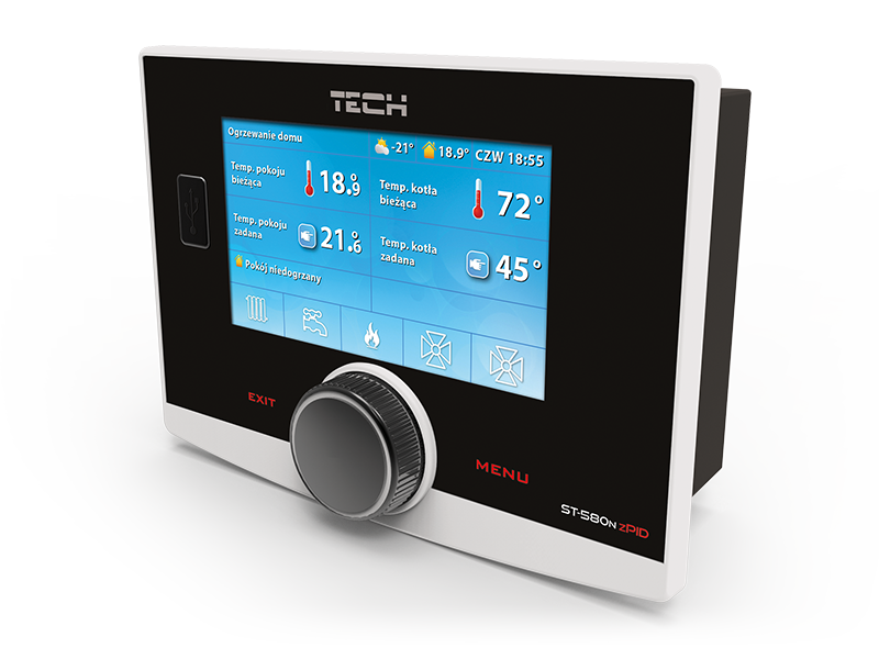 Контроллер ST-580 zPID предназначен для управления котлом с автоматической подачей топлива, оснащенным вентилятором и подающим устройством. Контроллер ST-580 zPID управляет насосом центрального отопления, насосом горячего водоснабжения, насосом напольного отопления, приводом смесительного клапана, а также работой вентилятора наддува и подающим устройством. Основной задачей данного контроллера, является поддержание заданной температуры теплоносителя на выходе из котла, при помощи изменения и поддержания необходимой скорости вращения вентилятора. Контроллер обеспечивает плавную регулировку частоты вращения вентилятора, мощность которого может изменятся от 0-100%. В зависимости от установленных пользователем параметров, фактической температуры теплоносителя на выходе из котла, а также температуры топочных газов, контроллер увеличивает или уменьшает скорость вращения вентилятора, обеспечивая более точное, заданное пользователем, значение температуры на выходе из котла. Благодаря функционалу данного контроллера, имеется возможность выбора одного из четырех режимов работы насосов: отопление дома, приоритет бойлера, параллельные насосы, летний режим. Так же предусмотрена совместная работа контроллера ST-580 zPID c двухпозиционным комнатным терморегулятором или терморегулятором со связью RS. Благодаря наличию данной функции, управление температурой в помещении становится наиболее комфортным.